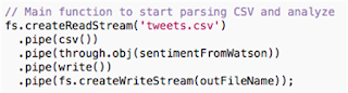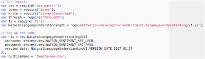 With the tweets now in a CSV and Watson at the ready, it was time to put the pieces together with node.js. I took advantage of the following node.js libraries: csv-parser, csv-write-stream, watson-developer-cloud.